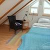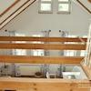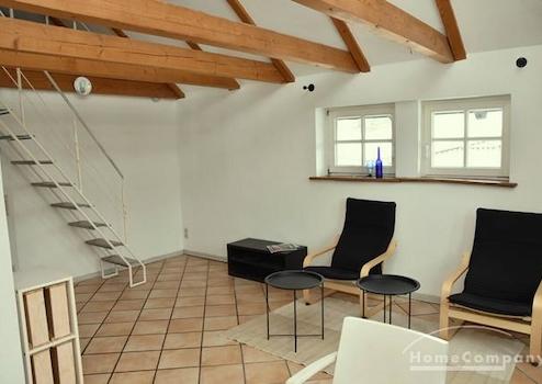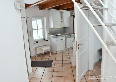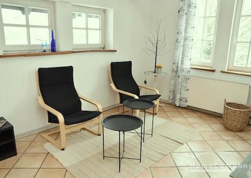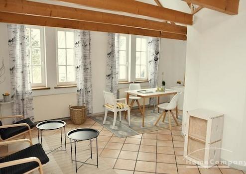 Sehr helle und freundliche Wohnung im 1. OG eines alten Speichers in idyllischer Lage auf Reiterhof in Lehrte. Eigener Eingang über Außentreppe. Wohnraum mit 2 Sesseln, Tischchen, Regalen, Smart-TV (noch nicht auf Bild ...