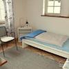 Schlafzimmer mit Gardrobiere, Tischchen, Stuhl und Bett 90 x 200 cm.