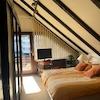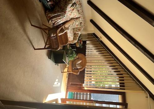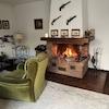 - Im Wohnzimmer ist ein gemauerter Kamin installiert.