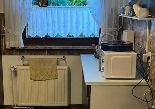 Die offen gehaltene Küche kann mit übernommen werden, ist aber kein muss, Sie ist bereits älter und kann auf Wunsch entfernt werden. Das Bad im DG verfügt über eine Wanne sowie einer Dusche, zusätzlich gibt es hier 2 Säulenwaschtische, so dass sich 2 Personen gleichzeitige für den Tag herrichten könnten. Durch 2 Dachflächen Fenster / Velux bekommt auch das Badezimmer sehr viel Tageslicht. Ein WC und ein Bidet vervollständigen das Badezimmer. Im EG ist ein Gäste Bad mit Waschtisch und WC, alle Sanitärgegenstände stammen aus dem Ursprungsbaujahr.