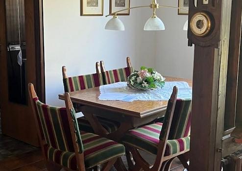 - Zwischen Essplatz und der freitragenden Treppe ist ein Raumteiler in Holz verbaut und umrahmt die dort befindliche Heizung.