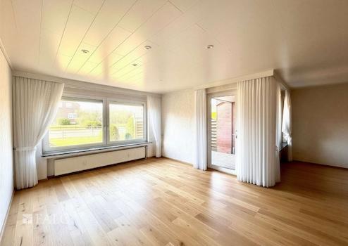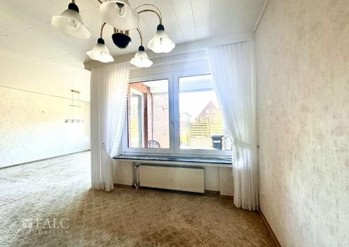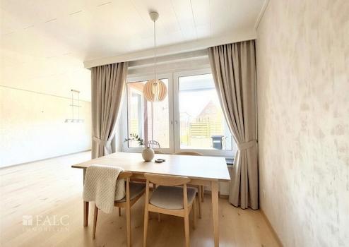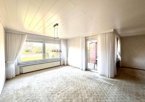 Das Wohn- und Esszimmer bietet Ihnen ausreichend Einrichtungsmöglichkeiten. Durch die großen Fensterflächen ist es freundlich und lichtdurchflutet. Von hier aus haben Sie einen direkten Zugang zur teilüberdachten Terrasse und in den Garten.