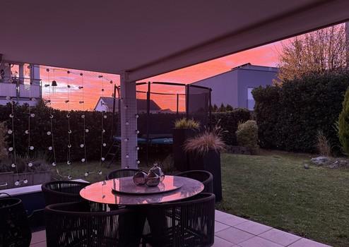• Sonnenterrasse: Perfekt nach Süden ausgerichtet. Eine neuwertige elektrische Markise (3,5 x 4,5 m) mit Beleuchtung bietet an heißen Tagen Schatten.