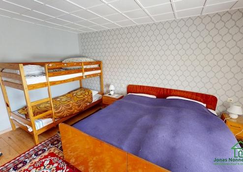 Das Gebäude verfügt über zwei Badezimmer mit Dusche und WC sowie eine Einbauküche. Auf dem Grundstück stehen insgesamt drei Außenstellplätze und zwei Garagen zur Verfügung. Das Objekt befindet sich insgesamt in einem einfachen, dem Alter entsprechenden Zustand und bietet Potenzial für weitere Modernisierungsmaßnahmen.