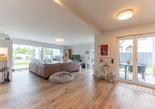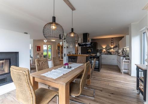 Das Herzstück des Hauses bildet der offene, beeindruckende Wohn- und Essbereich mit einer modernen offenen Küche und Kamin. Große Fenster sorgen für viel Tageslicht und ermöglichen den Zugang zu zwei Terrassen sowie dem sehr gepflegten Garten, der mit einem Gartenhaus zum Entspannen und Verweilen einlädt.