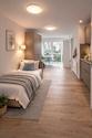 Der helle Wohn-/Schlafbereich mit integrierter, hochwertiger Einbauküche, sehr hochwertiger Möblierung, Fussbodenheizung, bodentiefe Fenster, sowie das moderne Bad bieten alles, was man für den Studienalltag kompakt und komfortabel braucht.
