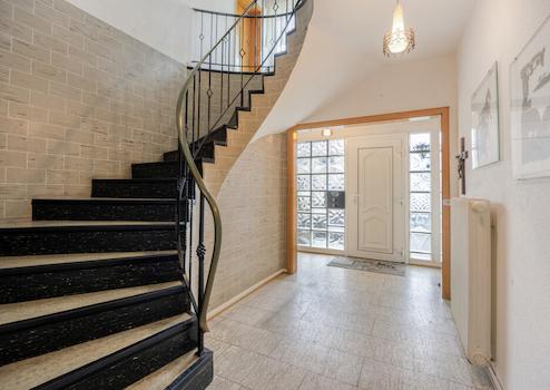 - Massive, großzügige Treppenhausanlage mit geschwungener Treppe und Metallgeländer