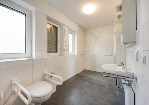 - Barrierearmes Duschbad erkennbar mit bodengleicher Dusche und Haltegriffen