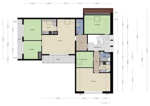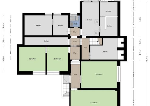 Das Haus wird von der großzügigen Eigentümerwohnung im Erdgeschoss dominiert. Die 182,28 m² verteilen sich auf insgesamt sieben Zimmer. Im ersten Obergeschoss gibt es zwei weitere Wohneinheiten, von denen die größere über eine Wohnfläche von 85,70 m² und die kleinere über eine Wohnfläche von 65,90 m² verfügt.