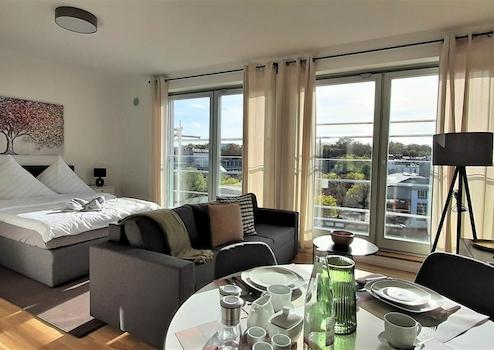 The apartment is fully furnished and fully equipped. Every detail has been thought of, whether a kitchen utensil, towels or bed linen. Everything is available. High-quality series from WMF, Siemens, Silit and Leonardo further enhance the equipment.