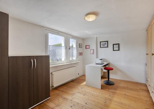 Im Obergeschoss befinden sich die Schlafzimmer, die durch ihre Holzbalkendecken und den warmen Holzboden bestechen. Das Badezimmer ist praktisch ausgestattet und rundet das Raumangebot ab.