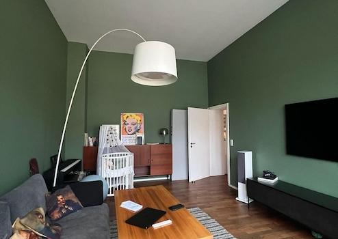 Die Wohnung verfügt über ein großzügiges Wohnzimmer mit viel Platz für Wohn und Essbereich, ein separates Schlafzimmer sowie ein halbes Zimmer, das sich ideal als Homeoffice, Ankleidezimmer oder Gästezimmer nutzen lässt. Die Raumaufteilung ist durchdacht und bietet sowohl Paaren als auch Singles mit Platzbedarf ein komfortables Wohnkonzept.
