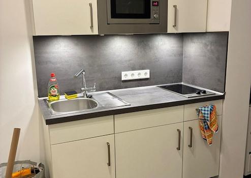 Küche: Moderne Einbauküche inklusive Herd, Mikrowelle und Kühlschrank.