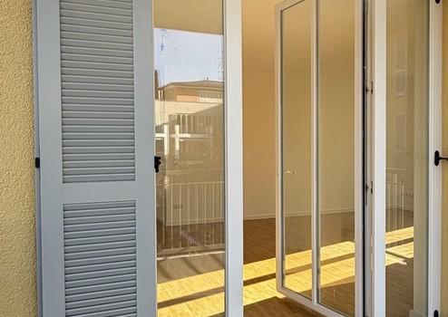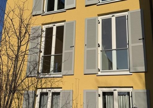 Die Wohnung hat durchgehend Echtholzparkett, bodentiefe Echtholzfenster, eine automatische Raumbelüftung. Alle Fenster verfügen außen über graue Holzjalousien.