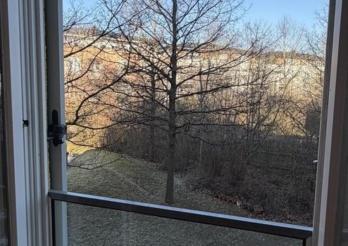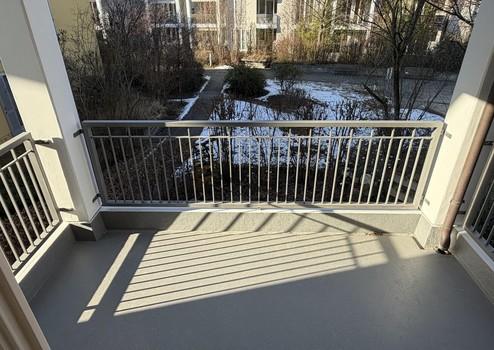 Vom großen, überdachten Balkon, mit Lichtanschluss in der Decke, hat man einen herrlichen, grünen Ausblick. Das gesamte Gebäude wurde im September 2025 außen neu gestrichen und der Balkonboden frisch geschützt/erneuert.