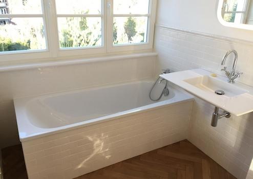 Das charmante Badezimmer mit Badewanne und separater Dusche hat Tageslicht.