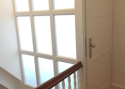 Die Wohnung befindet sich im Dachgeschoss eines frisch gestrichenem 20er