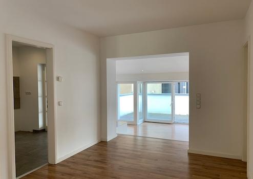Treten Sie dort ein, so befinden Sie sich im geräumigen Wohn-/Essdielenbereich der Wohnung.