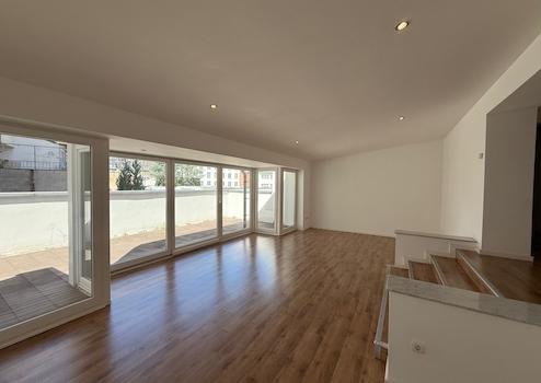 Die große, helle Fensterfront des Wohn Esszimmers verfügt auch über eine Schiebetüranlage, über welche man Zugang zur Westterrasse erhält.