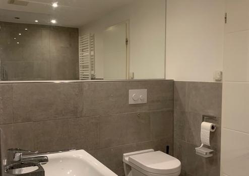 Badezimmer: helles, modernes Bad mit Bodentiefer Dusche und WC. Große Spiegelwand