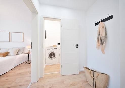 Ein zusätzliches Plus ist der praktische Waschraum innerhalb der Wohnung, der sowohl funktional als auch platzsparend integriert wurde.