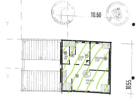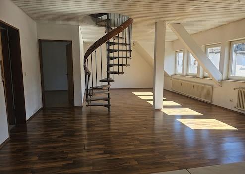 DG: 5 Zi. Maissonette (116,23 m² Wfl.) mit Küche und Bad und 2 WCs. Kaltmiete 850,- € inkl. Garage und Abstellplatz vor der Garage.