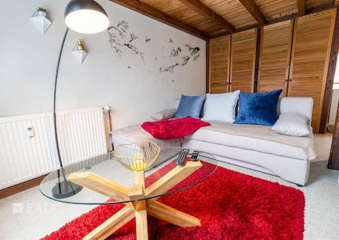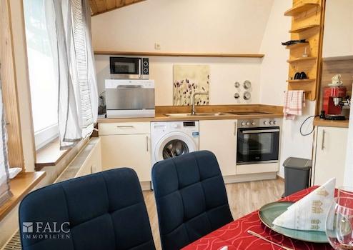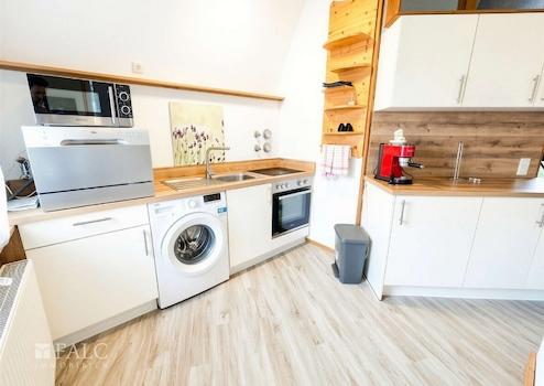 Diese vollmöblierte Dachgeschosswohnung bietet auf 49 m² ein modernes, sofort bezugsfertiges Zuhause. Der offene Wohnbereich ist geschmackvoll eingerichtet und hell. Die integrierte Küche ist vollständig ausgestattet – inklusive Kühlschrank mit Gefrierfach, Herd und Tisch-Spülmaschine. Der Schlafbereich befindet sich auf einer Galerie und bietet mit Bett und Stauraum einen gemütlichen Rückzugsort. Ein Schlafsofa kann ausgezogen werden und bietet eine zusätzliche Schlafmöglichkeit.