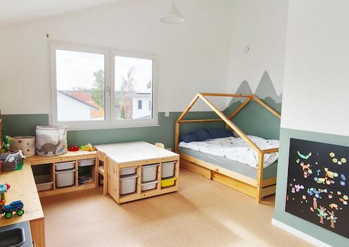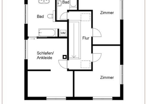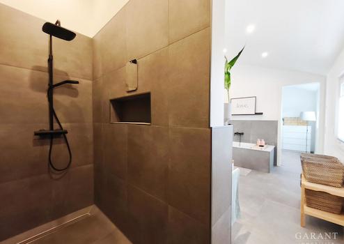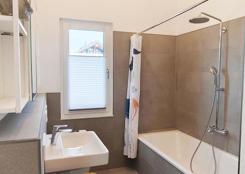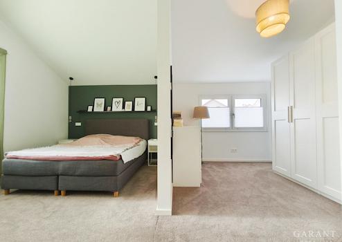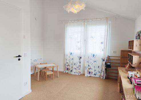 Im Obergeschoss überzeugt ein klar strukturierter Grundriss: Zwei große Kinderzimmer, ein separates Badezimmer sowie ein komfortabler Elternbereich mit Ankleide und eigenem Bad. Dieses lädt mit Badewanne und begehbarer Dusche zum Entspannen auf hohem Niveau ein.