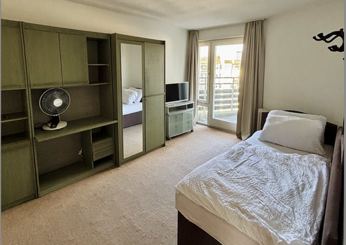 Alle Fenster sind entweder mit Rollläden, Aussenjalousien oder zusätzlich mit Sonnenschutzfolien der Firma SCHLOTTERBECK, Aichwald beschichtet. Drei der Zimmer, jeweils mit Smart-TV, bieten einen direkten Zugang zum Balkon und schaffen ein offenes, luftiges Wohngefühl.