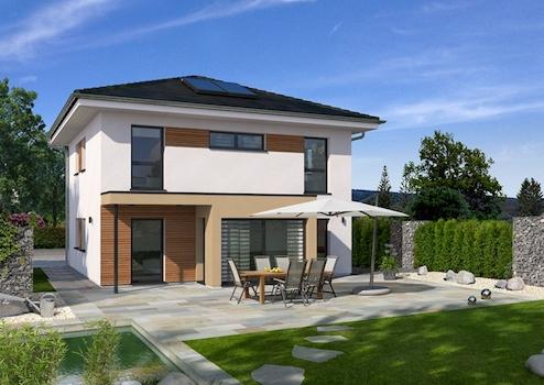 Der zweigeschossige Hausentwurf zur Stadtvilla bietet eine moderne Architektur mit einem Vordach und einer Teil-Holzverkleidung. An der Gartenseite des Hauses ist ein überdachter Terrassenbereich und ein Anbauelement geplant. Der Grundriss bietet im Erdgeschoss Platz für einen offen gestalteten Wohn-/Ess- und Kochbereich, eine Speisekammer, eine Diele mit Treppenaufgang, einen Haustechnikraum und ein Duschbad.