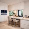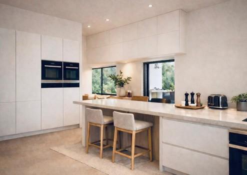 Eine halbe Ebene tiefer öffnet sich der beeindruckende Wohn-, Ess- und Kochbereich, der vollständig offen gestaltet ist und durch die Raumhöhe von bis zu 5m einen enormes Raumgefühl generiert. Große Fensterflächen sorgen für viel Licht und schaffen eine fließende Verbindung zwischen Innen- und Außenraum.