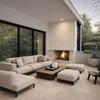 Ein besonderes Highlight ist der großzügige Kaminbereich aus weißem Sichtmauerwerk, der dem Raum eine warme und zugleich elegante Atmosphäre verleiht.