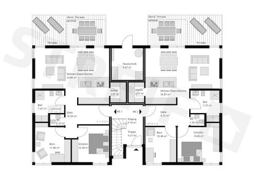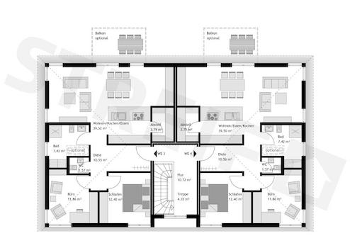 Das zweigeschossige Mehrfamilienhaus mit zwei Wohnungen überzeugt mit einer klassisch eleganten Architektur mit Walmdach und zwei behaglichen Terrassen. Der Hausentwurf kann mit Stahlbalkonen an der Gartenseite ...