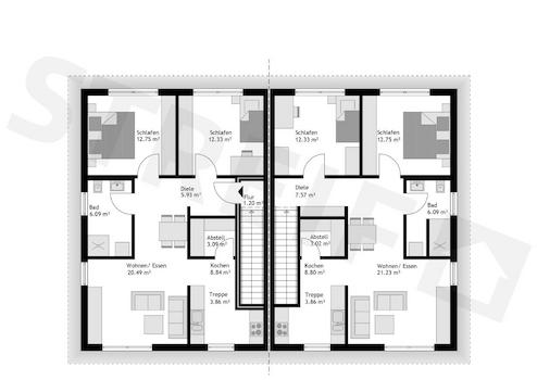 Das zweigeschossige Mehrfamilienhaus mit zwei Wohnungen überzeugt mit einer klassisch eleganten Architektur mit Walmdach und zwei behaglichen Terrassen. Der Hausentwurf kann mit Stahlbalkonen an der Gartenseite ...