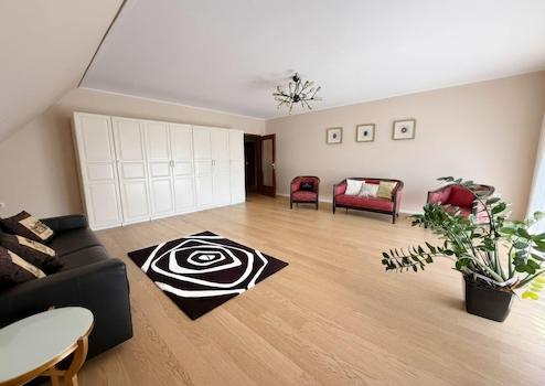 Über die Treppe erreichen Sie das Obergeschoss, das echte Flexibilität bietet. Neben zwei beeindruckenden Studioräumen (perfekt als Homeoffice, Atelier oder Kinderparadies) befindet sich hier eine separate Einliegerwohnung. Nutzen Sie diese Fläche für Gäste, ein Au-Pair, ältere Kinder oder generieren Sie attraktive Mieteinnahmen.