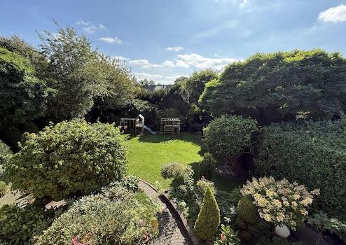 Bodentiefe Fensterflächen und hohe Decken schaffen einen fließenden Übergang zur Terrasse und geben den Blick frei auf einen wahren Schatz: Den uneinsehbaren, eingewachsenen Garten. Diese private Oase lädt mit altem Baumbestand, blühenden Sträuchern und gepflegten Rasenflächen zum Spielen und Entspannen ein.