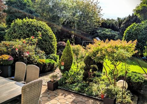 +Idyllischer, Garten mit sonniger Terrasse