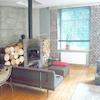 Über eine breite Treppe gelangt man in den sehr großen, ehemaligen Werkraum der Fabrik mit großen Fenstern nach Süd-West. Der 20KW- Kaminofen ist wasserführend, d.h. im Brennraum erhitztes Wasser gelangt in den Wasserkreislauf der Heizung und reduziert den Gasverbrauch bzw. ersetzt Gas komplett.