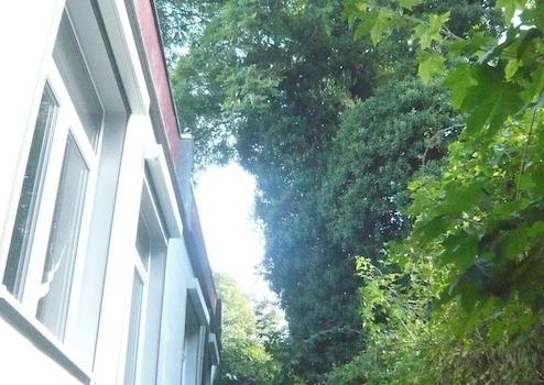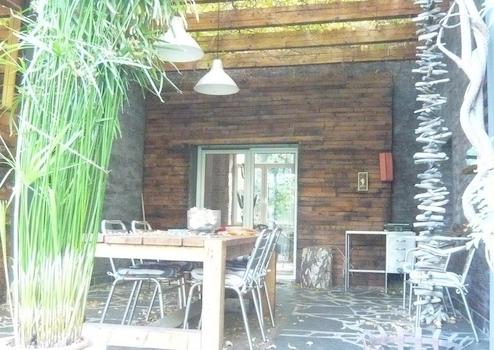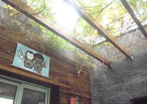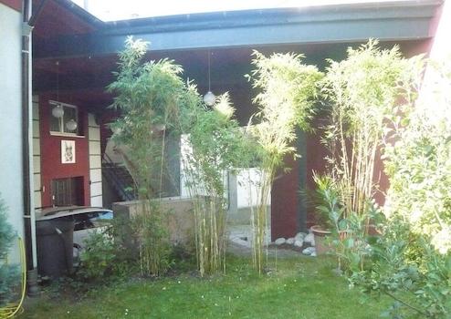 In den Garten gelangt man durch eine natürlich belichtete Loggia mit lebendiger, durchscheinender "Pflanzendecke", ein Hybrid aus in- und outdoor. Im Garten stehen Obstbäume (Apfel, Pflaume, Kirsche), immergrüner Bambus, Lebensbäume/Zypressen und eine große Birke. Ein eigener Kompost ersetzt die städtisch nicht vorgesehene Grüne Tonne. Durch vier 300 Liter Regentonnen kann der Garten, besonders der Bambus, 6-8 Wochen ohne Trinkwasser versorgt werden.