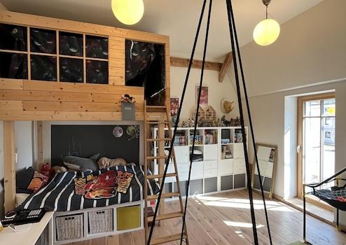 Im Obergeschoss sind zwei Schlafzimmer und zwei Bäder ideal für Eltern- und Kinderzimmer ausgestattet. Auch hier wurde Lehmputz verwendet und die Holztragstruktur des Daches freigelegt. Das Masterbad mit großen Fenster zum Garten und der eingerahmten Liegefläche bieten die Möglichkeit, auch hier zu entspannen, zu lesen, sich wohlfühlen,... Das Kinderzimmer verfügt über einen Balkon mit Überdachung.