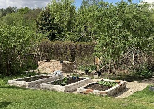 Mehrere Obst- und Zierbäume ergänzen den Garten und bieten im Frühling ein blütenreiches Schauspiel.