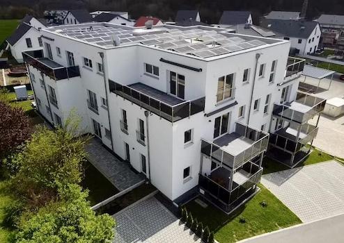 Auf dem sonnigen Grundstück wurde dieses mehrgeschossige Wohngebäude in ökologischer Holzbauweise als Effizienzhaus-40-PLUS errichtet. Die nachhaltige und wirtschaftliche Wärmepumpentechnologie sorgt für die primäre Energieversorgung des Gebäudes (Heizung und Warmwasser). Das Besondere daran ist, dass die am Dach aufgeständerte PV-Anlage mit einer Leistung von knapp 30 kW maßgeblich zur Energieunterstützung beiträgt. Hohe Heiz- und Nebenkosten müssen die Bewohner dieser Immobilie zukünftig nicht fürchten. Als Speichermedium für den gewonnenen Sonnenstrom wurde zusätzlich ein 12 kW-Energiespeicher installiert. Der nicht genutzte PV-Strom wird ins öffentliche Stromnetz eingespeist und durch den Energieversorger rückvergütet.