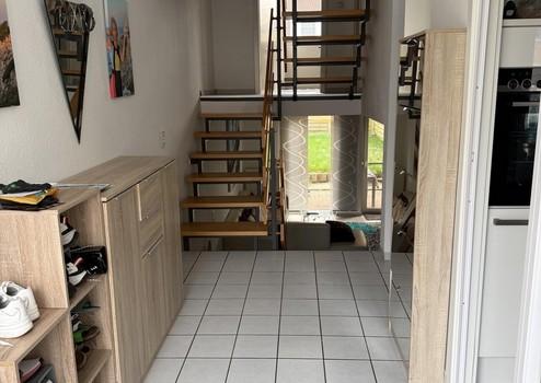 Es handelt sich um ein Reihenhaus auf versetzten Ebenen mit 4 Zimmern, einer Küche, Badezimmer mit Dusche und Badewanne, einem separatem Gäste-WC, sowie einem Kellerraum mit Waschmaschinen- und Trockneranschluss. Im Dachgeschoss befindet sich zusätzlich ein großer ausgebauter Nutzraum von ca. 18m² . Zum Garten gehört eine Terrasse (ca. 12 m²) , sowie ein kleines Abstell-/Gartenhäuschen. Das Reihenhaus wurde 1999 in Niedrigenergiebauweise erstellt. Es hat ein offenes Treppenhaus mit Holzstufen aus Buchenholz.