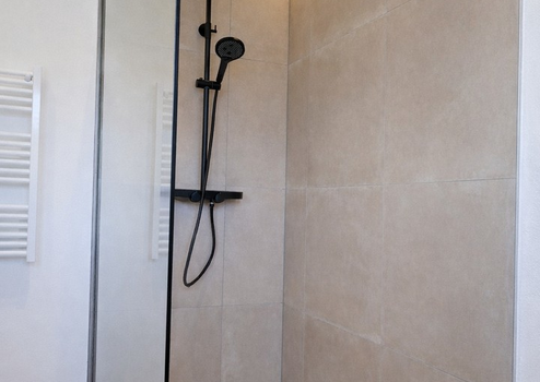 •Modernisiertes Badezimmer mit Dusche, Fußbodenheizung und Handtuchheizkörper