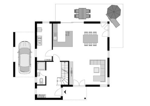 Das moderne Energiesparhaus mit Carport setzt mit einer Wohnraumerweiterung und einem überdachten Eingangsbereich, Übereck-Fenstern und einem Carport Akzente. Durch die Wohnraumerweiterung im Eingangsbereich entsteht ein separater Raum für die Garderobe. Der offen gestaltete Wohn-/Ess- und Kochbereich ist großzügig angelegt. Eine XXL-Panorama-Hebeschiebetür, Terrassentüren und bodentiefe Fensterelemente, die übereck angeordnet sind, fluten den gesamten Wohnbereich mit Tageslicht.