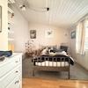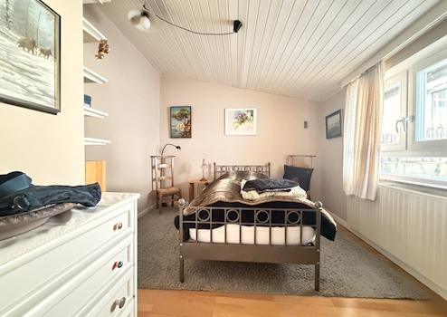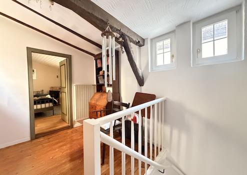 Über eine charmante Holztreppe gelangt man in das Obergeschoss, das mit zwei geräumigen Schlafzimmern viel Flexibilität für Paare oder kleine Familien bietet. Der großzügige Flurbereich auf dieser Ebene bietet ausreichend Platz, um ihn zum Beispiel als Homeoffice, Leseecke oder gemütlichen Arbeitsplatz zu nutzen. Praktische Abstellmöglichkeiten runden diese Ebene ab.