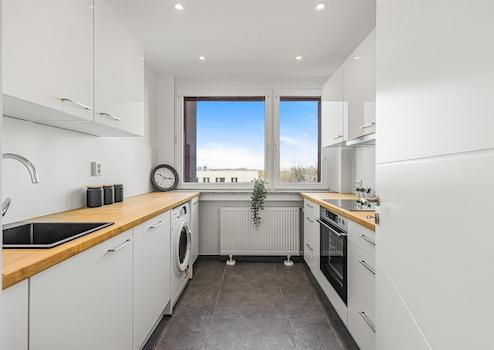 - die Küche bietet folgende Elektrogeräte: Mikrowelle, Kühlschrank, Herd, Ofen, Spülmaschine, Gefrierschrank und Waschtrockner von namhaften Herstellern