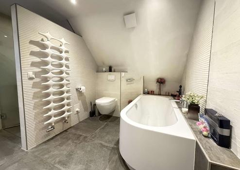 -- Das Designbad im Dachgeschoss ist mit einer eleganten Badewanne, zwei Waschtischen, einer ebenerdigen Dusche mit Glasabtrennung, Hänge-WC und hochwertigem Designer-Handtuchheizkörper ausgestattet – alles in zeitloser, moderner Optik.