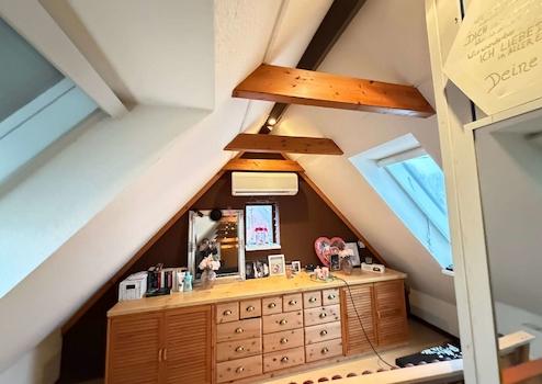 Ein echtes Highlight ist das exklusive, komfortable Badezimmer mit hochwertigen Materialien und moderner Ausstattung. Der ausgebaute Spitzboden bietet zusätzlichen Wohn- oder Schlafraum. Auch hier ist eine moderne Einbauküche im Kaufpreis enthalten. Die Wohnung verfügt über zwei separate Zugänge: im Erdgeschoss sowie über eine Außentreppe im hinteren Gartenbereich.