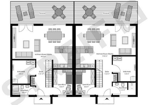 Das zweigeschossige Mehrfamilienhaus mit zwei Wohnungen überzeugt mit einer klassisch eleganten Architektur mit Walmdach und zwei behaglichen Terrassen. Der Hausentwurf kann mit Stahlbalkonen an der Gartenseite ...